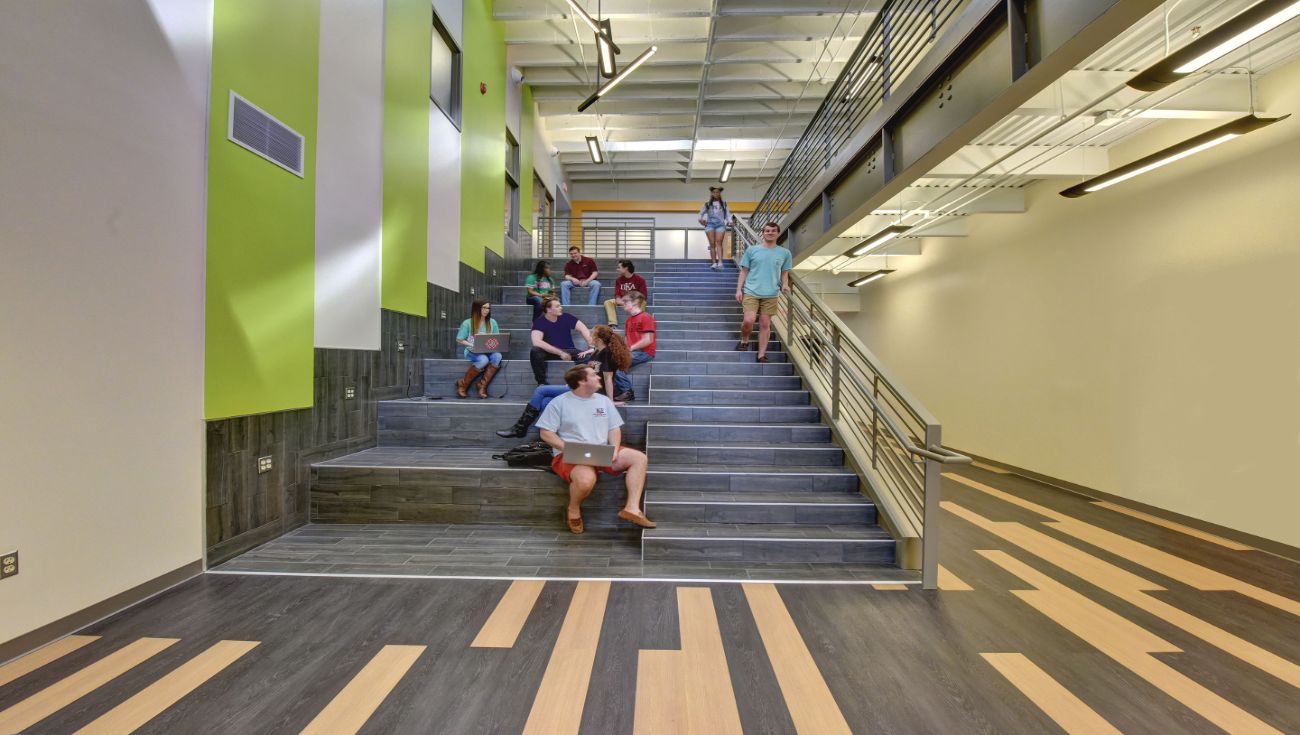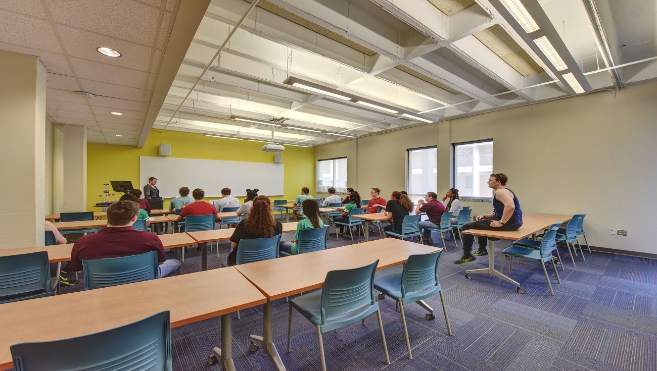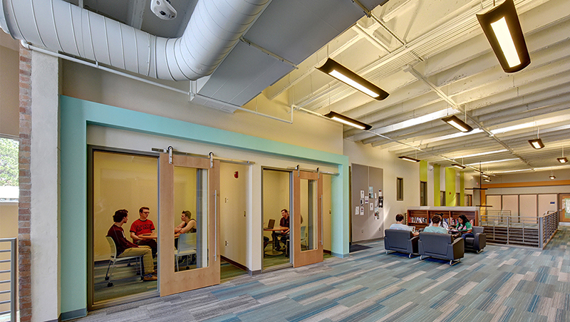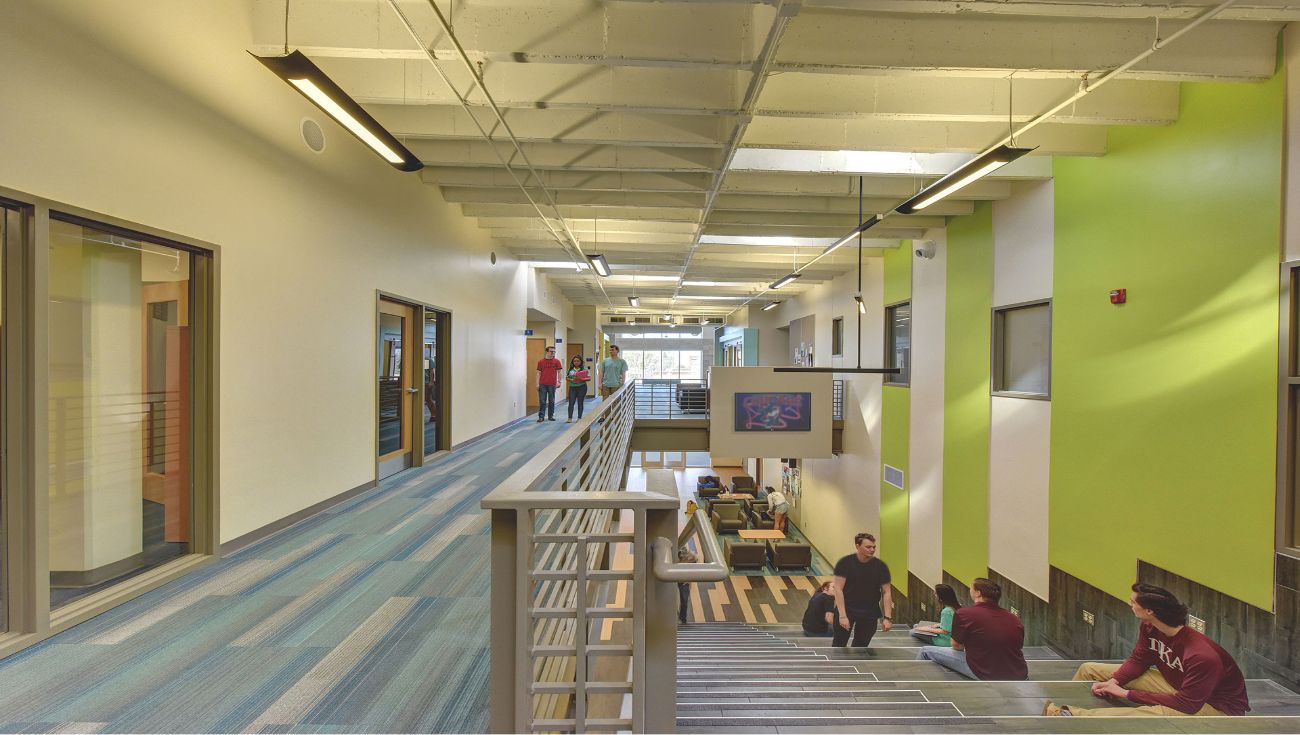 By working closely with faculty and facilities managers, 2WR reimagined the building’s layout to better support adaptive classrooms, mobile computer labs, faculty offices, and student meeting areas. The 80-seat auditorium was also fully renovated to accommodate modern teaching technologies and create a more dynamic educational setting. Additionally, the redesign incorporated wider corridors and a central stair with lounge seating, significantly improving circulation and connectivity throughout the building.