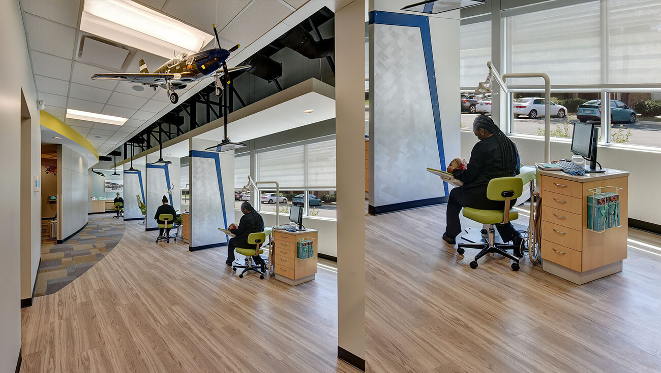 2WR Architects partnered with Dr. Keller to bring his vision for Columbus Children’s Dentistry to life. His goal was to create a fun and welcoming space where kids feel at ease. Drawing inspiration from aviation, the design reflects an aircraft hangar aesthetic, emphasizing simplicity, durability, and functionality—much like an airplane’s construction.